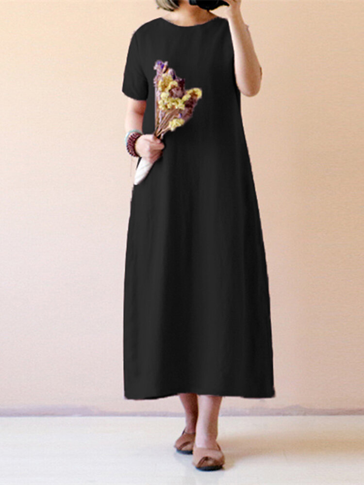 Pure Color Short Sleeve Long Maxi Vintage Dresses